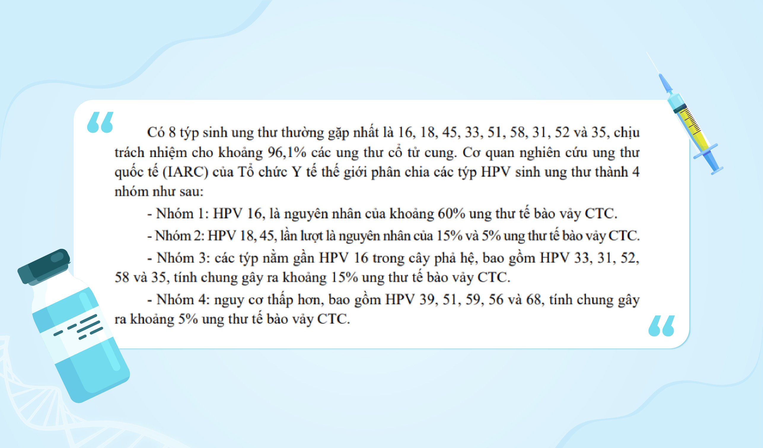 12 týp HPV “sinh ung thư” được Cơ quan Nghiên cứu Ung thư Quốc tế (IARC) của Tổ chức Y tế thế giới phân chia thành 4 nhóm theo mức độ sinh ung thư (phần 1, mục 2, trang 1).