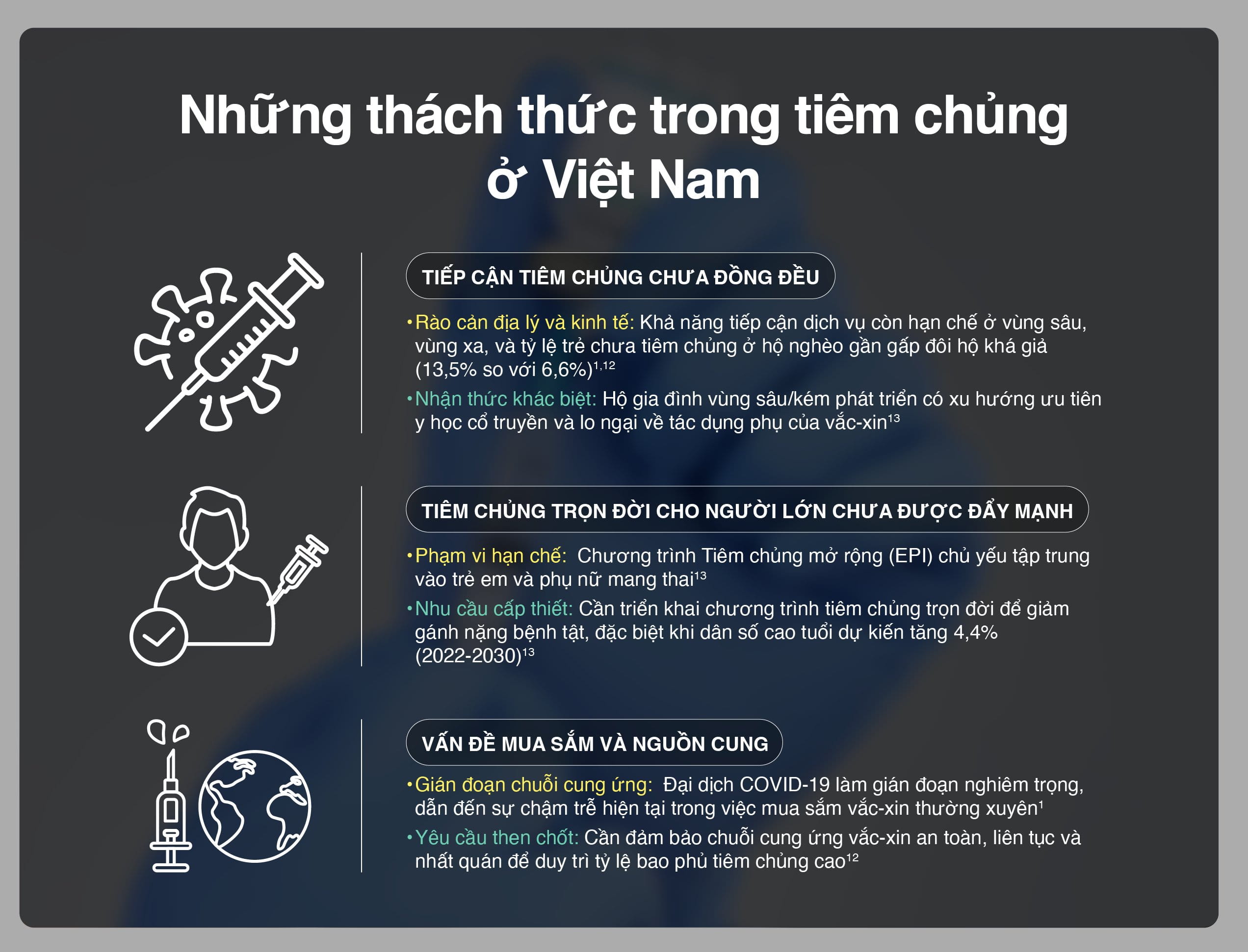 Chương trình Tiêm chủng Mở rộng (EPI) hiện nay chủ yếu tập trung vào trẻ em và phụ nữ mang thai13. Trong khi đó, tỷ lệ tiêm chủng cúm cho dân số trưởng thành còn rất thấp, chỉ khoảng 1%13. Trước bối cảnh dân số cao tuổi dự báo tăng 4,4% trong giai đoạn 2022-2030, việc xây dựng và triển khai chương trình tiêm chủng trọn đời trở nên đặc biệt quan trọng nhằm giảm gánh nặng bệnh tật cho cộng đồng và áp lực lên hệ thống y tế13.