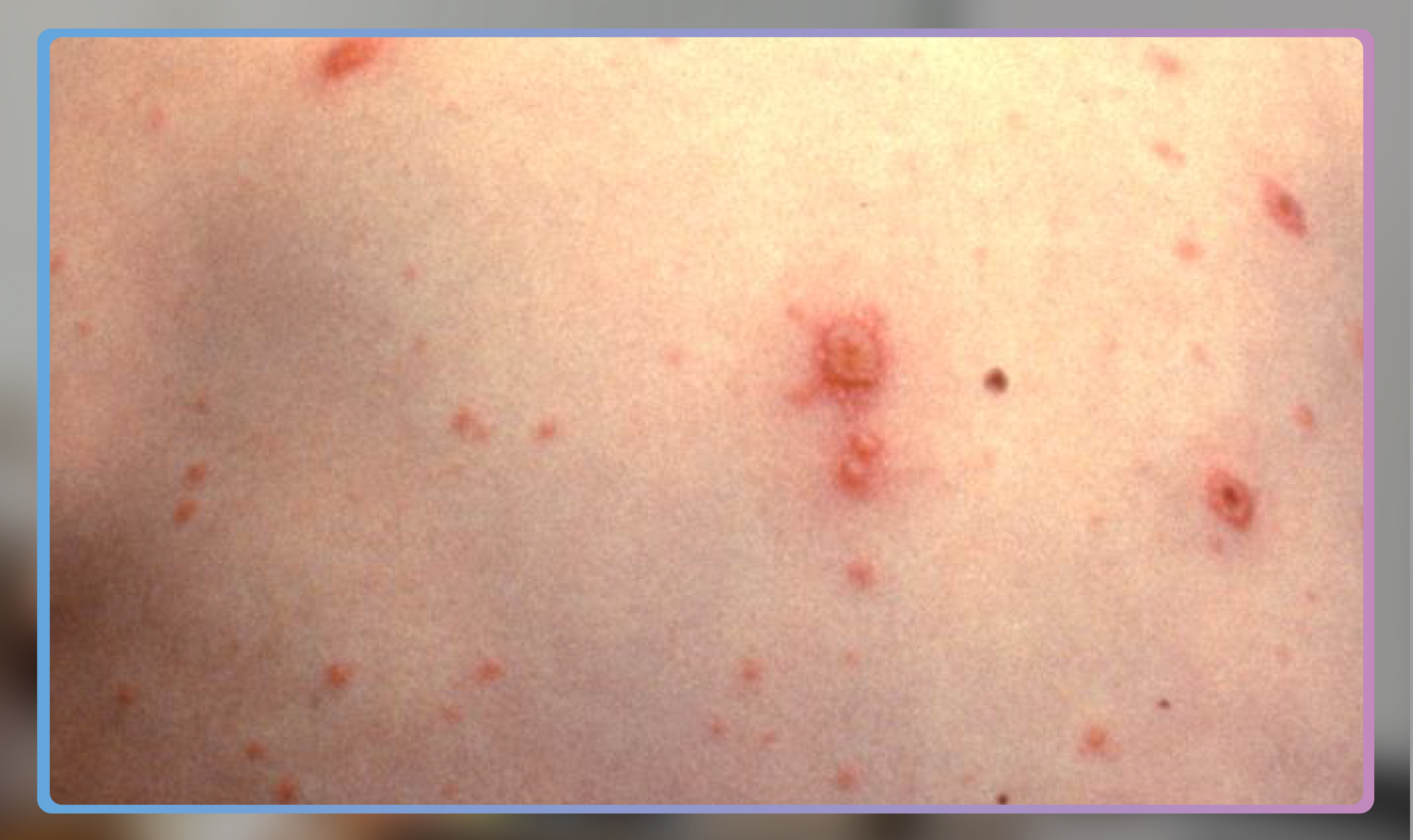 Các triệu chứng khởi phát không đặc hiệu như sốt (thường nhẹ đến trung bình), mệt mỏi, chán ăn, đau đầu, hoặc đau bụng nhẹ có thể xuất hiện 1-2 ngày trước khi phát ban3. Phát ban điển hình bắt đầu với các nốt dát đỏ, đến các nốt sẩn, rồi thành các bóng nước chứa dịch trong trên nền hồng ban, sau đó, chúng trở nên đục và đóng vảy trong vòng 24-48 giờ3. Các đợt sang thương xảy ra liên tiếp (thường 2-4 đợt trong 5-7 ngày), dẫn đến các tổn thương da khác nhau (dát, sẩn, bóng nước, mụn mủ, đóng vảy) xảy ra cùng lúc trên cùng một vùng da3,13.