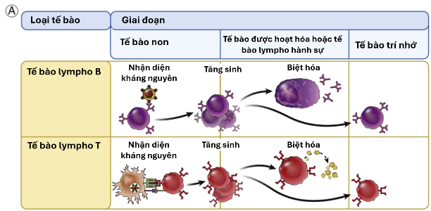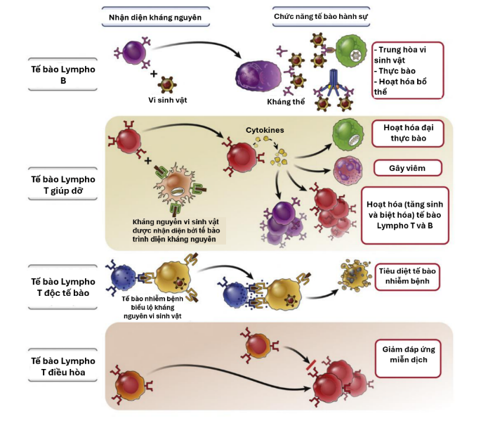 2.2. Miễn dịch thích nghiKhi miễn dịch bẩm sinh không kiểm soát được mầm bệnh, miễn dịch thích nghi sẽ được huy động để nhận diện và tấn công đặc hiệu tác nhân gây bệnh10. Mặc dù khởi phát chậm hơn, đáp ứng này lại chính xác và có khả năng ghi nhớ, giúp cơ thể phản ứng nhanh hơn khi tái phơi nhiễm10. Miễn dịch thích nghi gồm miễn dịch dịch thể (điều hòa bởi tế bào B, giúp trung hòa và loại bỏ tác nhân ngoại bào) và miễn dịch qua trung gian tế bào (điều hòa bởi tế bào T, giúp tiêu diệt vi sinh vật nội bào và tế bào nhiễm)11.