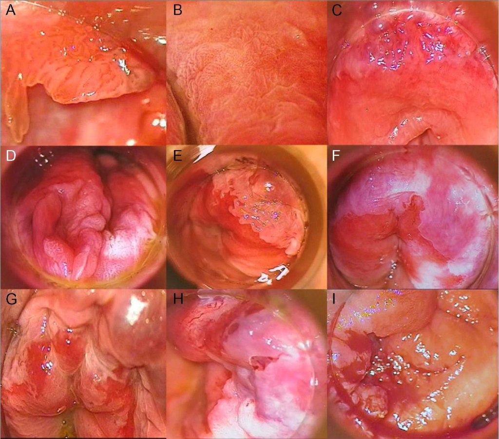Hình 1. Đặc điểm tân sinh nội biểu mô hậu môn (AIN) qua soi hậu môn độ phân giải cao. A, Sùi mào gà trên bệnh nhân AIN độ 1. B, AIN độ 2 biểu hiện dạng nhú với các chấm mạch máu. C, Mảng acetowhite (mảng trắng sau khi tiếp xúc axit) với mạch máu bất thường ở góc phần tư trên phải và trên trái ở bệnh nhân được chẩn đoán AIN độ 2. D, Mảng acetowhite lan rộng có dạng lát đá ở góc phần tư dưới phải và dưới trái ở bệnh nhân có AIN độ 2. E, Mảng acetowhite có ranh giới rõ ở góc phần tư trên trái, tương ứng với AIN độ 2. F, Các mảng acetowhite dạng chu vi ở bệnh nhân có AIN độ 3. G, Các mảng acetowhite và niêm mạc dễ vỡ với các vùng xuất huyết, ăn mòn ở bệnh nhân có AIN độ 3. H, Mảng acetowhite và các mạch máu dày, ngoằn ngoèo ở các góc phần tư trên. I, Khối u tiết dịch, xuất huyết ở bệnh nhân bị ung thư biểu mô tế bào vẩy xâm nhập7.
